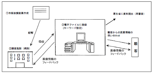 新たに製造承認が得られた新薬は市販後6年間に約1万例の症例を集め、実際臨床に適用された新薬の安全性と有効性について得られたデータを統計解析して、厚生省に再審査申請する義務がある。症例を集める方法としてとして、調査票を作成し、全国病院の臨床担当医師に調査対象の新薬を投与した患者の臨床経過、安全性、有効性等について記載してもらい、集計データを統計解析し、厚生省に提出(以上を新薬の市販後のPMS調査という)。 |