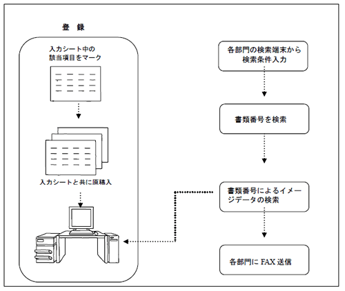 いる「書類番号」を元にファイリングサーバからイメージ情報を検索し、各部署のFAXに出力できるよ