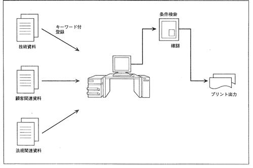 技術資料(電気系、機械系)、顧客関連資料(竣工報告書)、法規関連資料等を、キーワードを付してスキャナーで登録。 |
