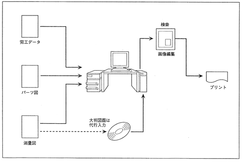 完工物件データ、パーツ図、測量図を、キーワードを付してスキャナで登録。(スキャナ読み取りサイズ以上の書類の登録は、代行入力業者への依頼も検討。) |